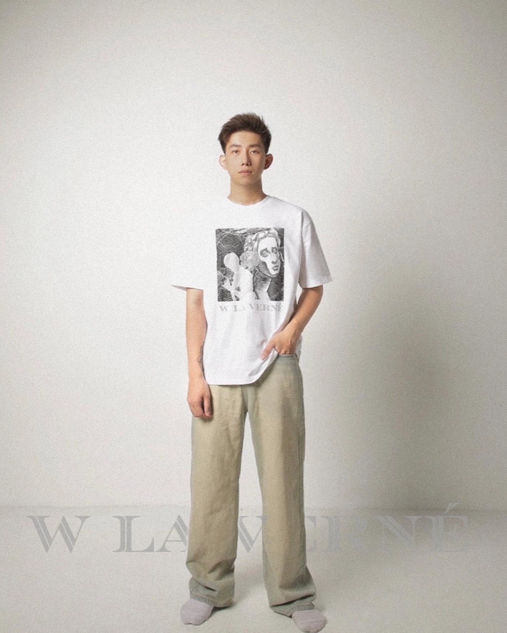 Trên nền áo thun trắng tinh khôi, hình ảnh được trình bày bắt mắt. Ở phía dưới, một cặp đôi đứng gần nhau, biểu tượng cho tình yêu và sự kết nối. Họ đứng bên cạnh một bông hoa tươi sáng, tượng trưng cho sự tươi mới và nảy nở của cuộc sống.
